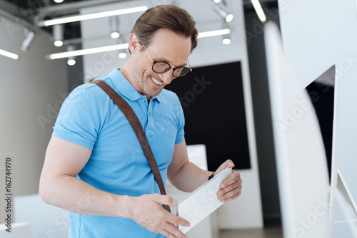 Extremely happy man looking at product information plate in showroom