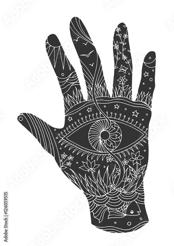 eye in hand symbol world, universe vector hand drawn illustration design