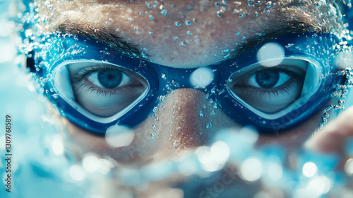 Eyes of the Swimmer: A close-up captures the focused gaze of a swimmer beneath the surface of water, accentuated by goggles and droplets.