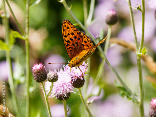 (Fabriciana adippe) Papillon le Moyen nacré posé et butinant sur des fleurs de chardons en Forêt-Noire