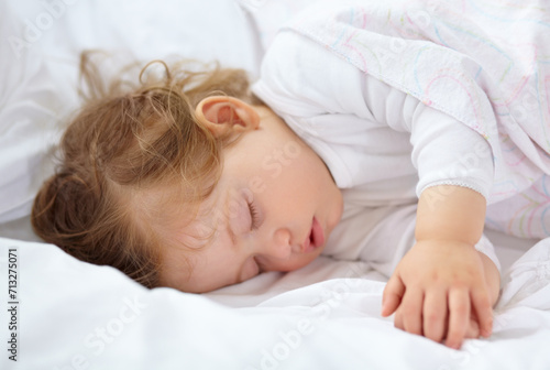 Face, baby and kid sleeping on bed for calm break, peace and dreaming to relax at home. Tired young child asleep with blanket for newborn development, healthy childhood growth or rest in nursery room