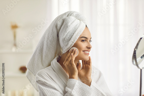 Face care. Young beautiful woman happily wipes her make-up and cleans her face with white round cotton pad. Woman in white bathrobe and with towel on her head takes care of her skin looking in mirror.