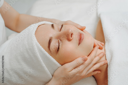 face massage, young attractive caucasian woman, beautiful relaxed lady with closed eyes smiling, white towel, spa therapist doing facial and head massage in beauty salon, skincare and bodycare concept