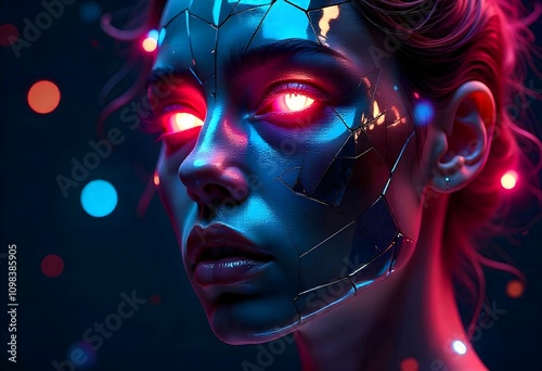 Face of shattered mirrors glowing with neon patterns