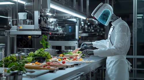 Faceless Robots Organizing Ingredients and Slicing Vegetables in a Modern Kitchen Environment