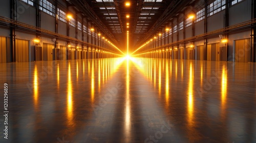 Factory interior, sunlight beams, empty floor, industrial architecture, background for manufacturing