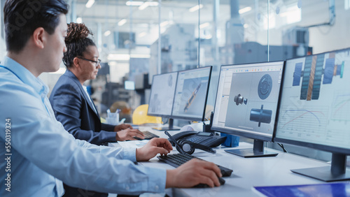 Factory Office Design Agency: Industrial Engineers Drafting Equipment 3D Layouts of a Heavy Industry Machine Parts on a Computer CAD Software. Modern Technological Research and Development Center.