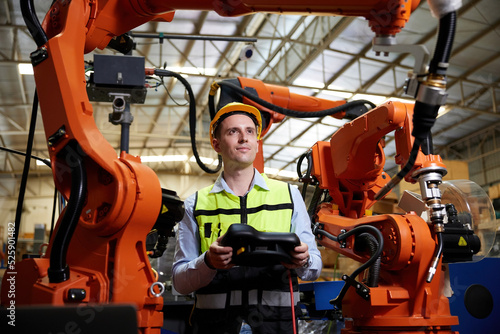 factory worker or engineer operating remote switch controller to control robot machine in the factory
