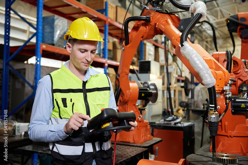 factory worker or engineer operating remote switch controller to control robot machine in the factory