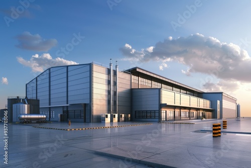 Factory's exterior, featuring clean lines, innovative architecture, and eco-friendly features. Beautiful simple AI generated image