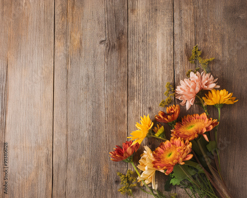 Fall flowers and leaves on old wooden table, flat lay, space for text