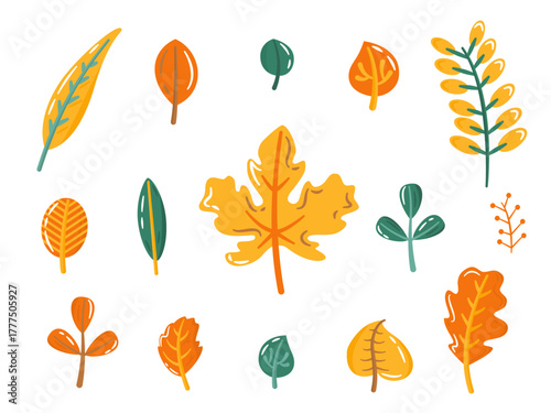Fall leaves vector set. Autumn yellow, orange and green foliage. Flat illustration in cartoon style.