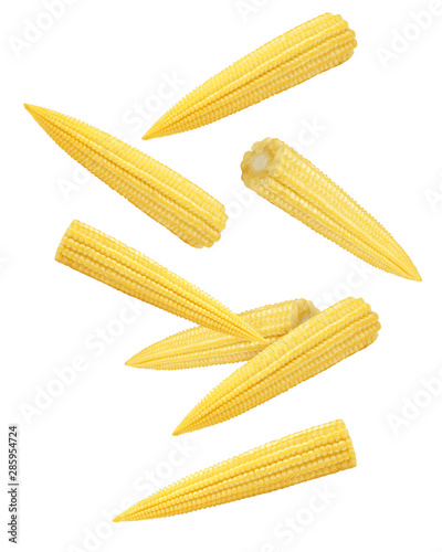 Falling baby corn, isolated on white background, clipping path, full depth of field