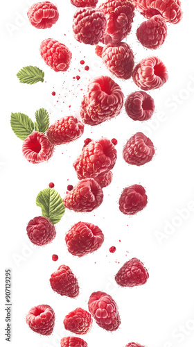 Falling juicy raspberries isolated on white background, full depth of field, transparent png background