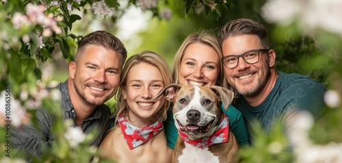 Family adopts two pets in a lush garden heartwarming scene outdoor close-up pet adoption and family joy