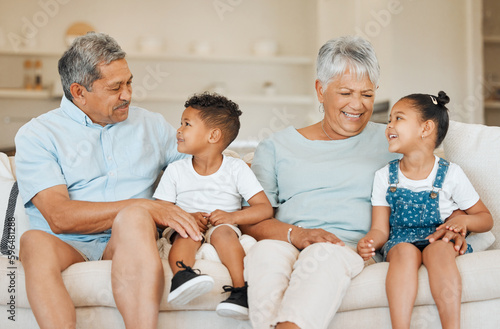 Family and friendships are two of the greatest facilitators. Shot of grandparents bonding with their grandchildren on a sofa at home.