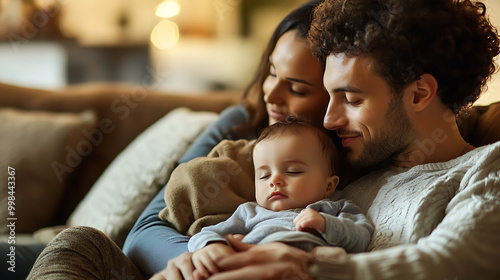 Family embracing moment, cozy atmosphere with sleeping baby, soft light.