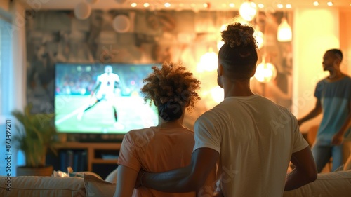Family enjoying evening watching sports game on TV at home, cozy living room atmosphere with warm lighting