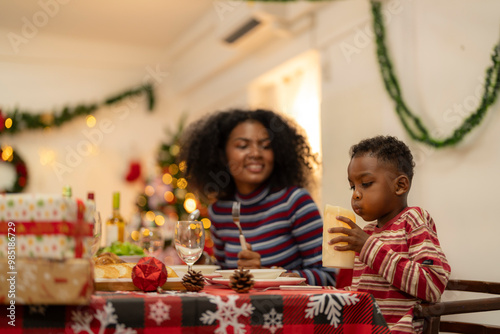 family moment during Christmas as they exchange gifts around festive dinner table. The table with Christmas-themed tableware, candles and delicious food. The room is adorned with holiday decorations.