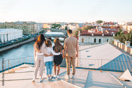 Family on rooftop enjoying with view of beautiful sunset in Sankt Petersburg in Russia