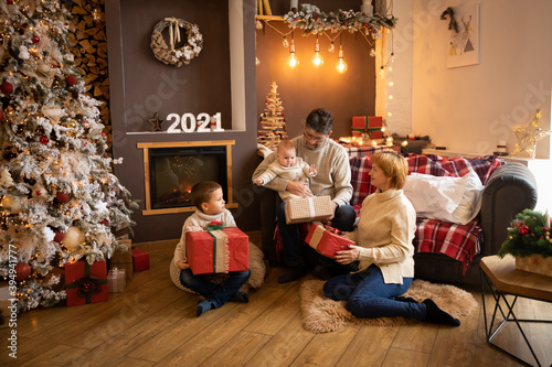 Family Opening Christmas Presents near Christmas tree in modern decorated home, Happy New year 2021