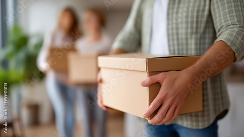 Family packing cardboard boxes together for a move, family relocation lifestyle concept, defocused background, with copy space