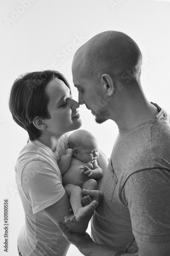 family photo on a white background: parents spend time with their children. mom and dad hug the baby. the concept of childhood, fatherhood, motherhood, IVF