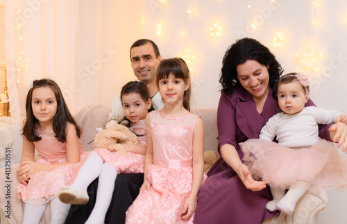 family portrait of a parents and children, sitting on a couch in home interior decorated with lights
