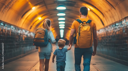 Family strolls through a warmly lit underground tunnel while enjoying a leisurely outing on a sunny day