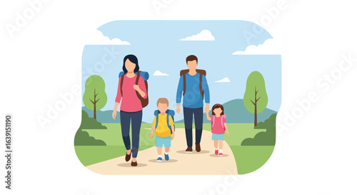 Family trip adventure with mom, dad, son, and daughter hiking on a path amidst green trees, enjoying a scenic landscape. This family trip creates bonding moments.
