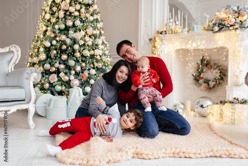Family with children, sitting on the floor near the fireplace and Christmas tree