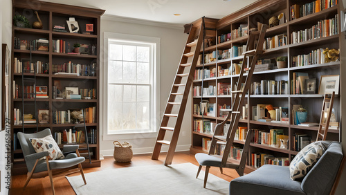 Fancy home library interior design, modern study room with book shelves, home library interior design, ai generated