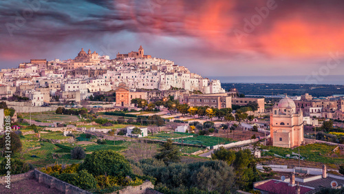 Fantastic morning cityscape of Ostuni town. Adorable spring sunrise in Apulia, Italy, Europe. Traveling concept background.