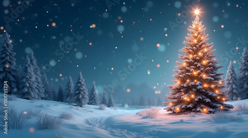 Fantastic winter landscape with christmas tree. 3D rendering. Christmas background with christmas tree, snow and stars. Generative AI