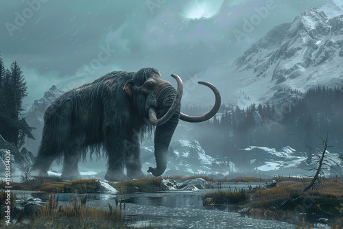 Fantastically majestic mammoth in its natural habitat with large long tusks, abstract vivid composition consists of fictional unreal fantastic vision on background