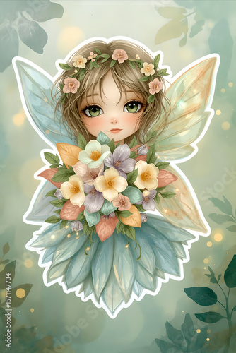 Fantasy Fairy Character Surrounded by Colorful Flowers and Leaves with Subtle Background Bokeh