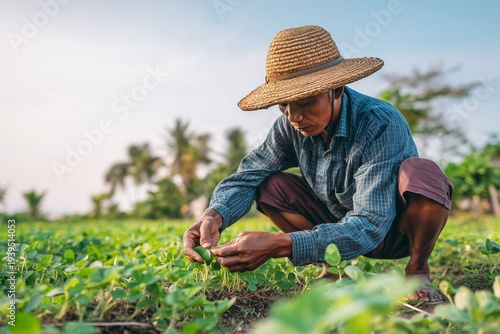 Farmer harvesting plants in field.