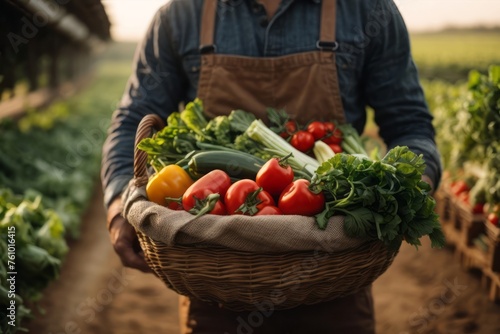 farmer holding fresh vegetables in rattan basket, agriculture, farming and harvesting concept