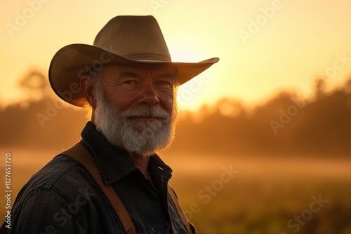 Farmer in field at sunrise in misty morning light, rich textures , with copy space