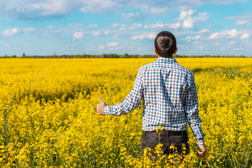 farmer in mustard field. Selective focus.