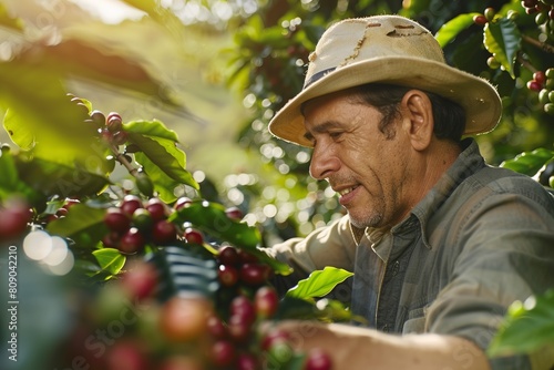 Farmer picking Arabic coffee beans on the coffee tree.