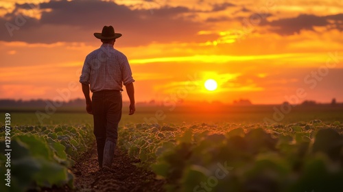Farmer Walking Through Crop Field at Sunset with Vibrant Sky