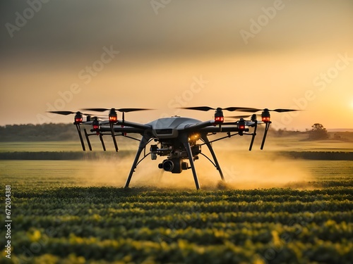 Farmer with drone spraying pesticides on a field of vegetable at sunrise.