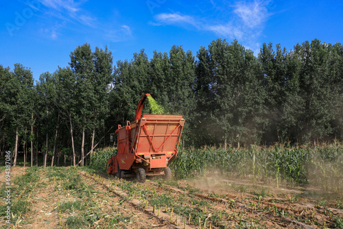 Farmers drive harvesters to harvest sweet corn in the fields.