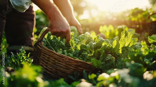 Farmers harvesting crops on an organic farm, filling baskets with fresh vegetables under the warm sunlight