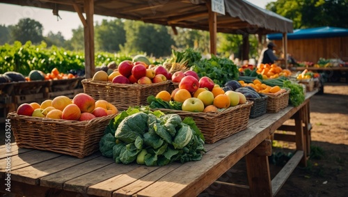 farmers market stand displaying a variety of fresh, organic produce. Include baskets and crates filled with colorful fruits and vegetables like apples, carrots, and leafy greens.