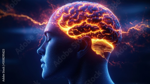 Fascinating photo realistic image of a human head with fiery brain symbolizing intense emotion and creative thinking