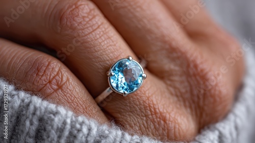 fashion jewelry photography, fashion editorial featuring a latina woman wearing a modern aquamarine ring with focus on the gemstone, shot against a pastel wall