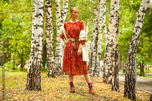 Fashion model. Young blonde woman in red dress