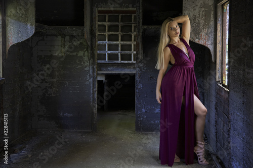 Fashion woman posing in the train wagon at the post area in abandoned Red Star graveyard